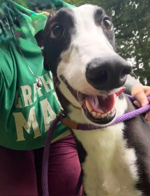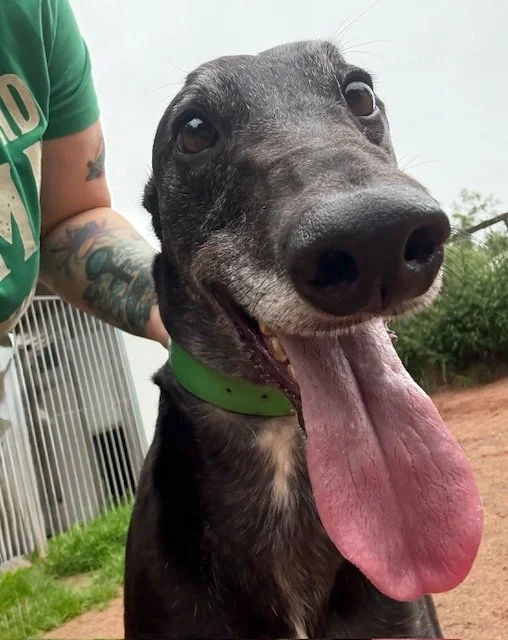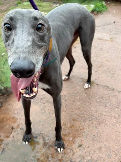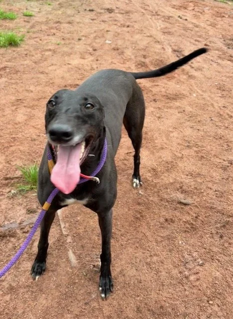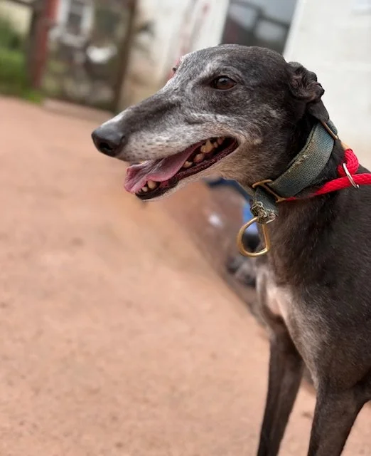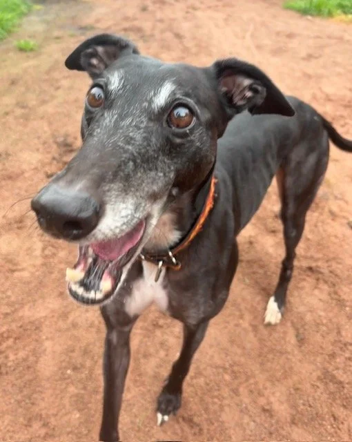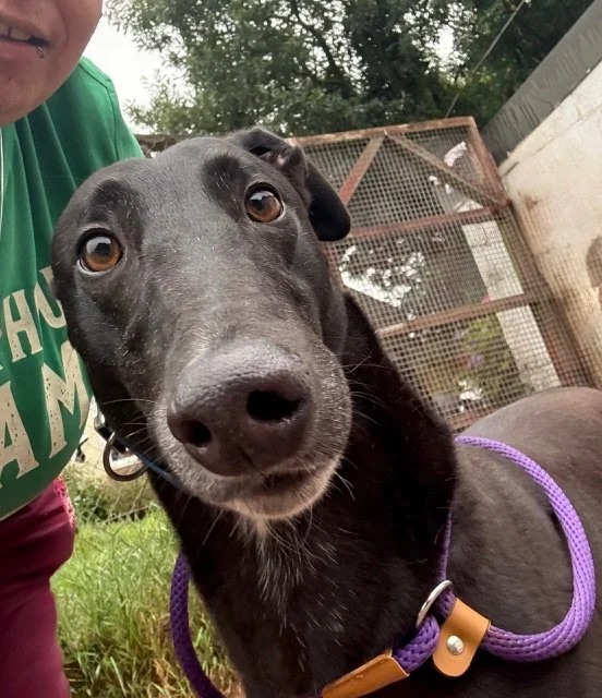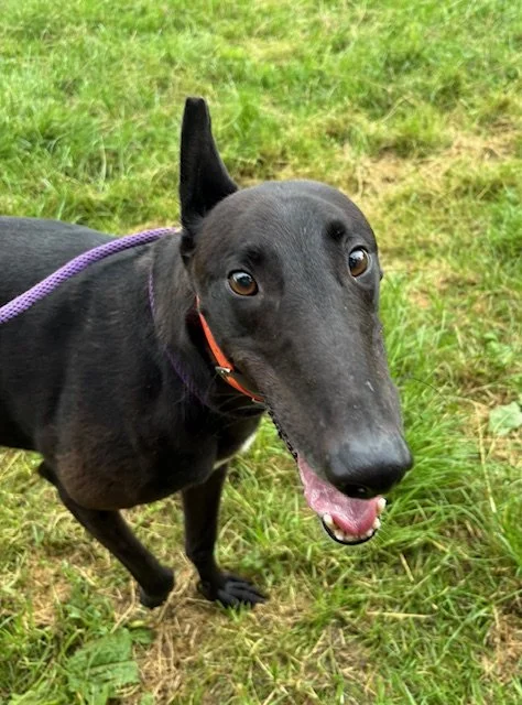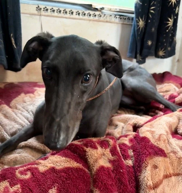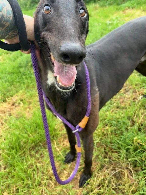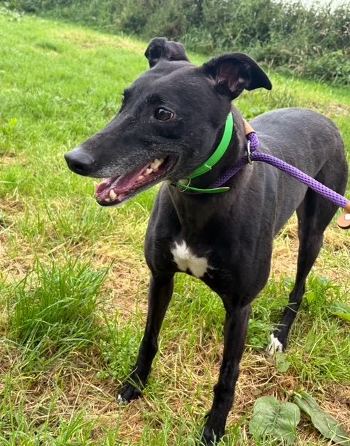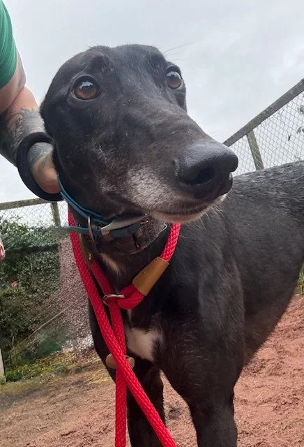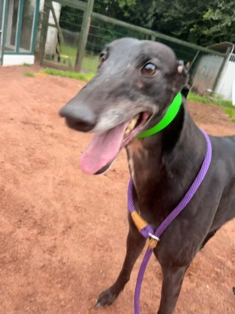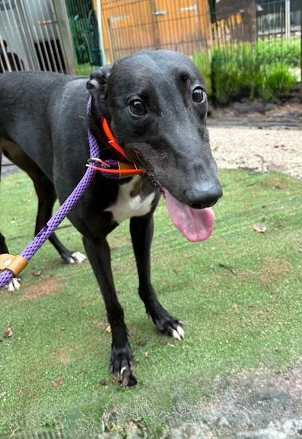 Raven is a lovely 4 year old boy. He may be large, but that just means there's more of him to love! He's a typical lazy greyhound boy who loves nothing more than lounging around, snoozing and watching the world go by. When he's not lazing around, he does love his toys and having a play. Raven walks well on the lead and travels well in the car and he loves his food too. Poor Raven isn't keen on wind and rain, so he'd be happy to not have a walk if it's bad weather!