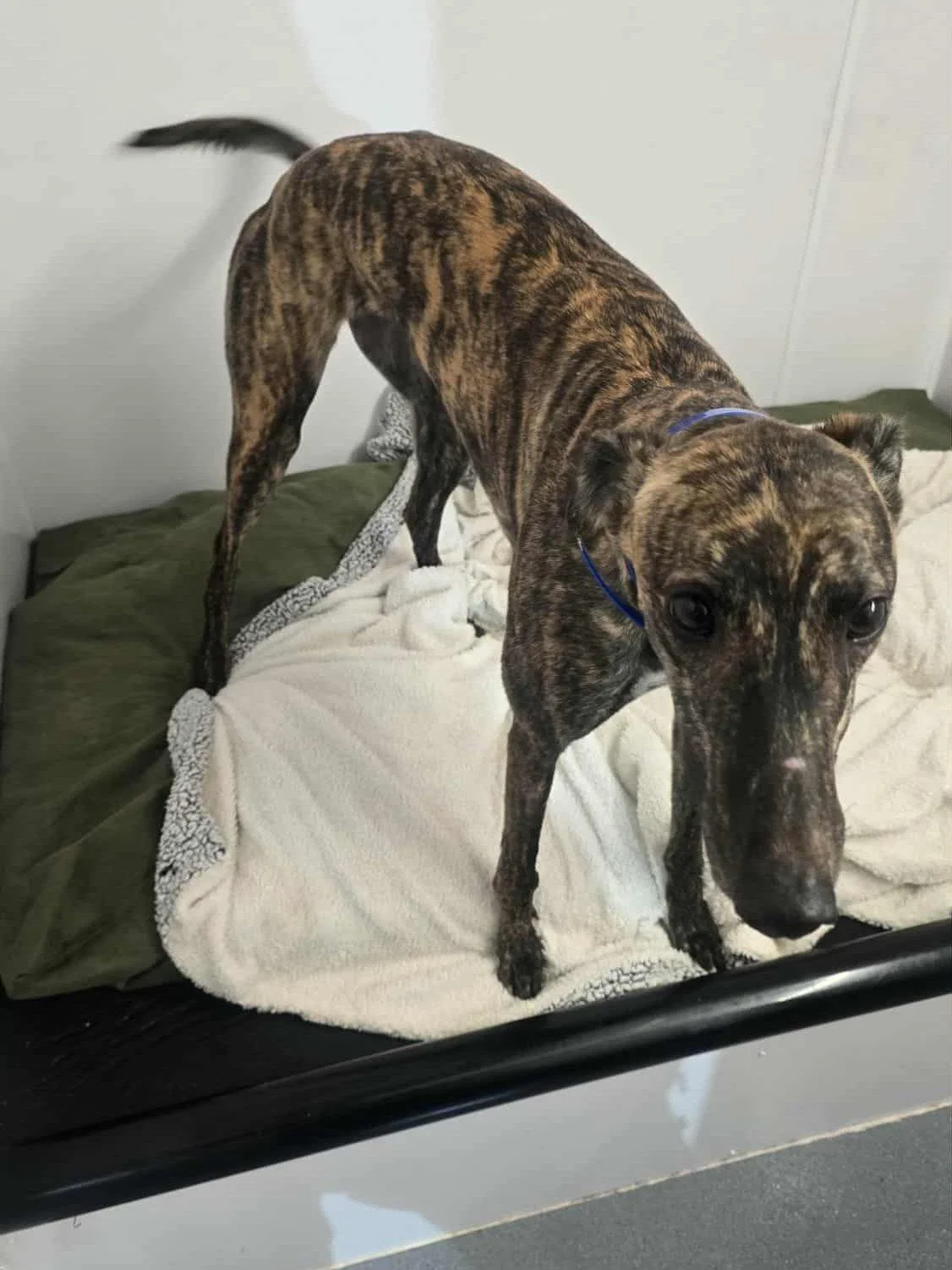 Betty is 6 years old and she gets on well with her greyhound friends. She's playful, affectionate and loves her food! She could live alone or with another greyhound, with successful introductions, but isn't cat friendly. She's a typically lazy greyhound girl and loves a nice snooze!