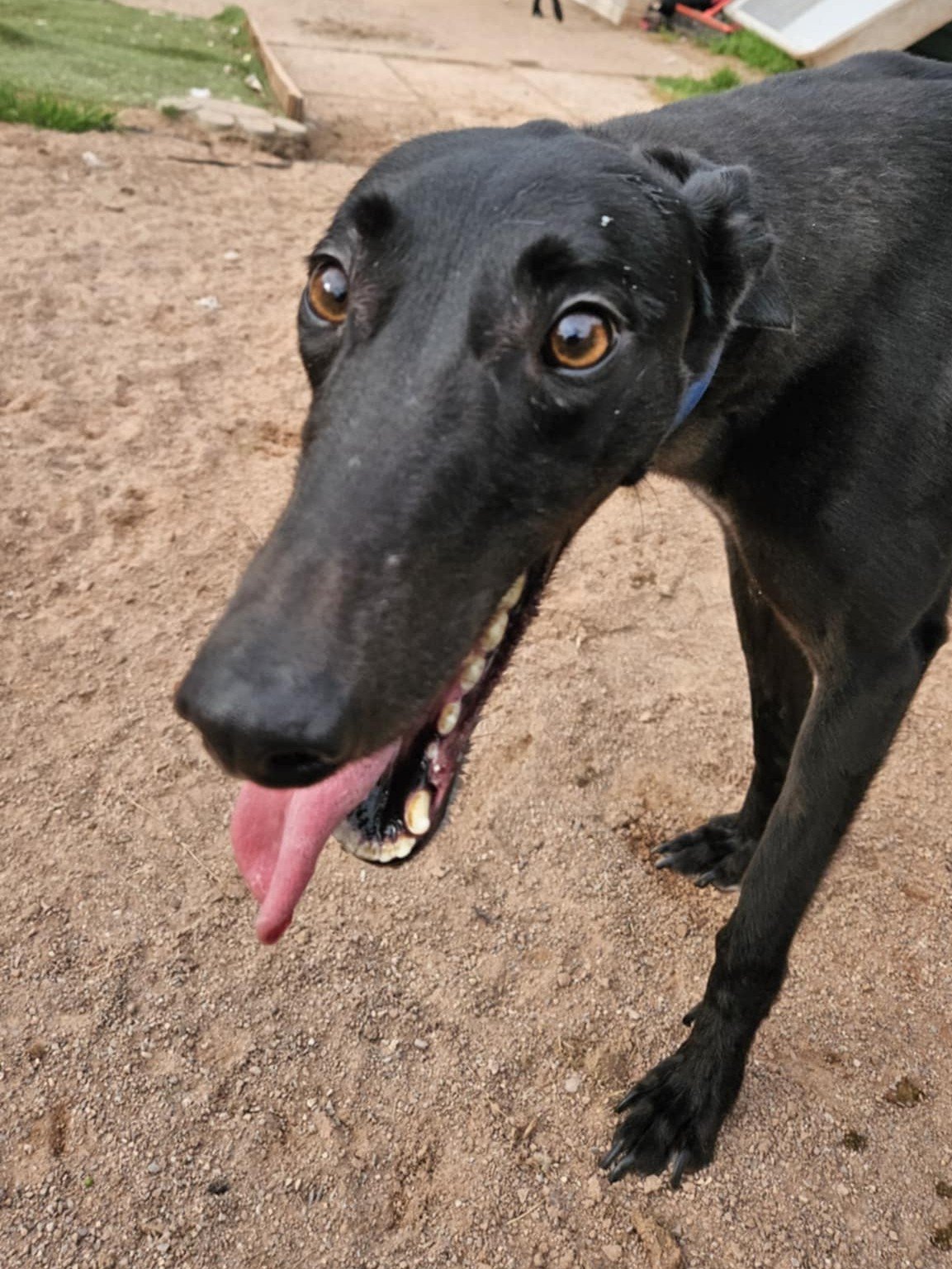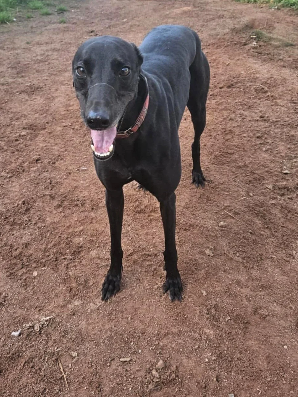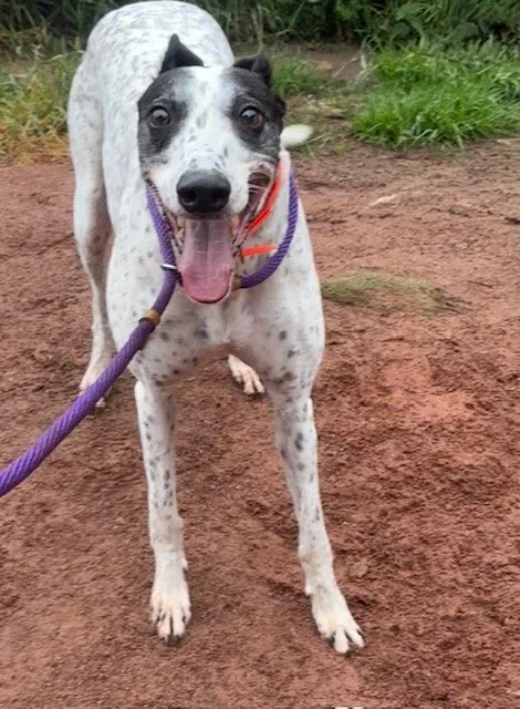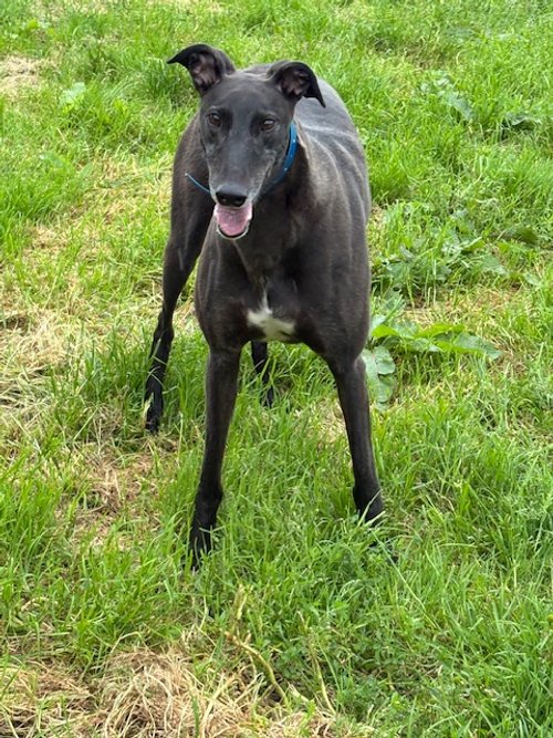 Dennis is a lazy boy and typical greyhound! He absolutely loves to sleep! When he is awake, he loves nothing more than to explore in the paddock and have a good wander around. Dennis loves his food and his treats, and he's great on the lead. He absolutely loves his toys too! Unfortunately, Dennis isn't cat/small furry friendly, sorry.